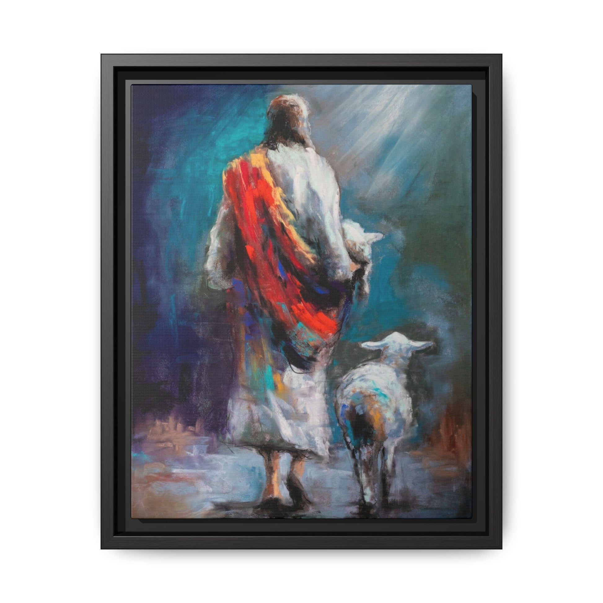 Soft light falls across a quiet path. Jesus walks slowly, cradling a lamb against his chest while another follows at his heels. The scene feels gentle and steady — the hush of trust, the pulse of care. Hung on a wall, the matte canvas brings out muted tones and subtle detail, inviting a pause for reflection. This framed artwork sits comfortably in a prayer corner, a nursery, or a living room where faith and calm are welcome. The tactile texture of the canvas and the warm pine frame make the image feel like a lived-in memory, something to return to when you need a moment of quiet reassurance.