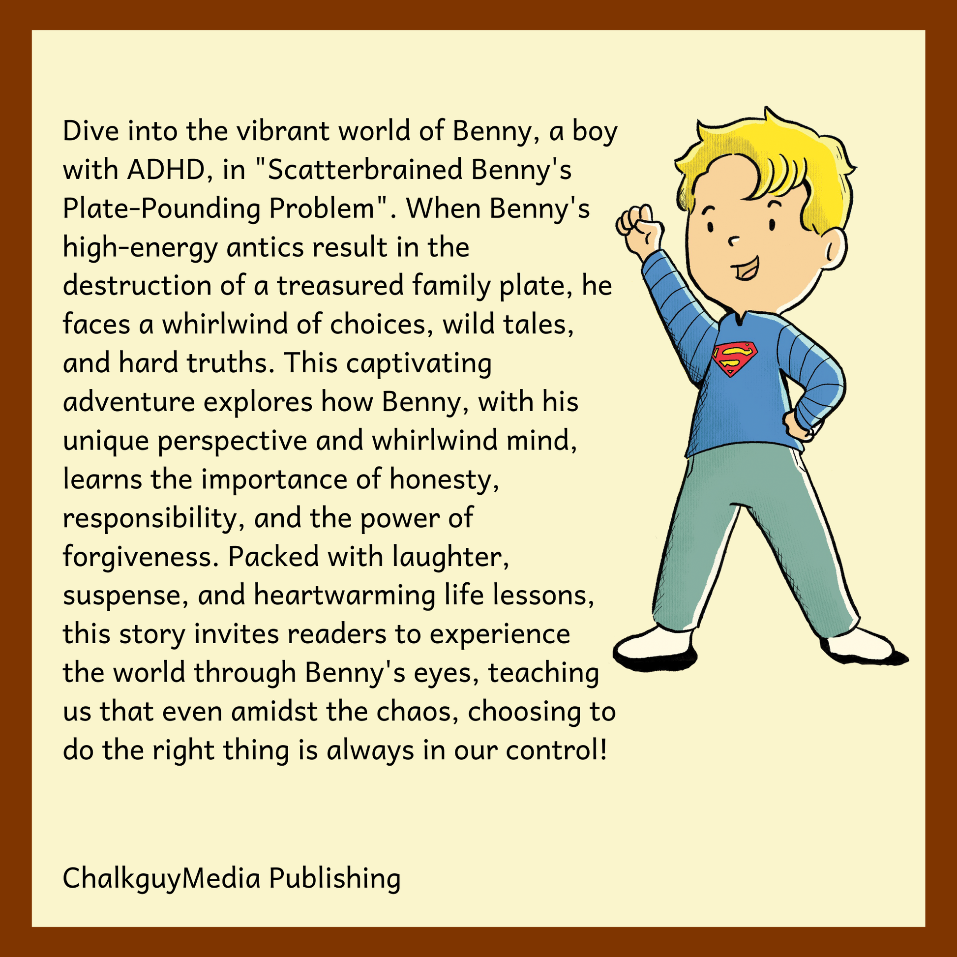 Welcome to the world of Benny in "Scatterbrained Benny's Plate-Pounding Problem". Benny is not your typical kid - his ADHD makes his life a daily whirlwind of energy and spontaneity. But what happens when his boisterous antics lead to a disaster at home? The result: a beloved family plate smashed to smithereens.